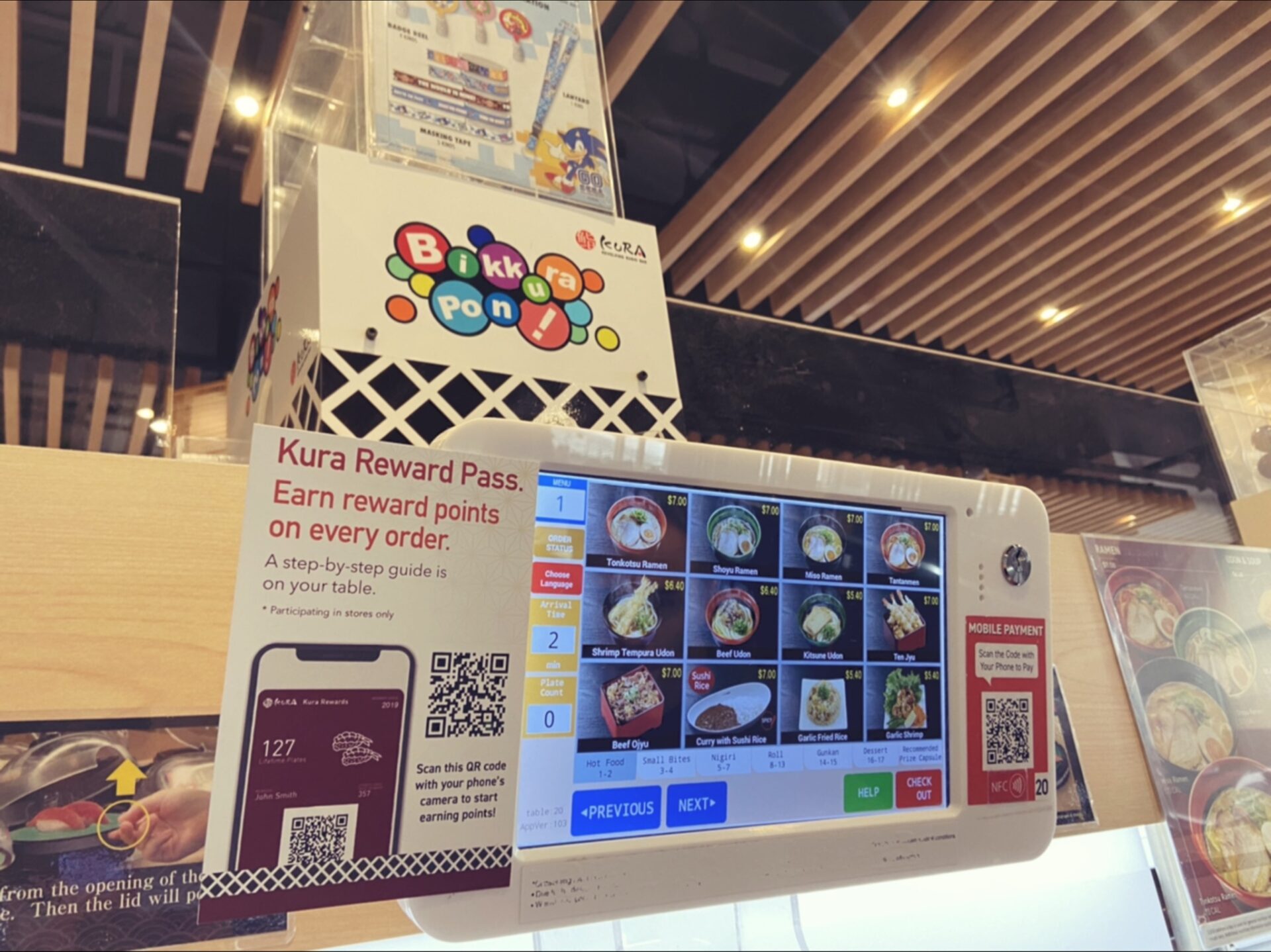 You put your plate after eating on the small socket at your table, they count it automatically. And it starts playing Bikkura Pon every 5 plates. Kids love it